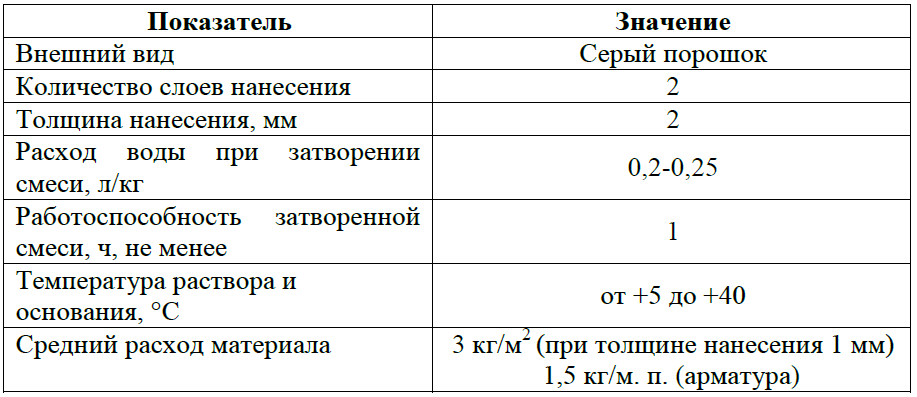 3 кг/м2 (при толщине нанесения 1мм) 1,5 кг/м.п. (арматура)